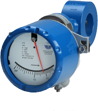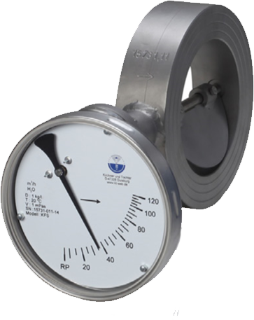 The 50 mm thick ring features a half-round plate that is fastened to a rotating spring-loaded spindle. The angle between flap and ring changes according to the rate of flow, and a breakaway-proof magnetic coupling transfers the movement to an external pointer (operating principle).